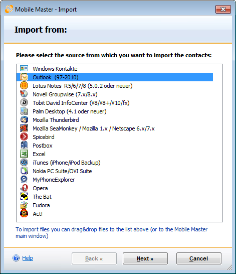 Import the address book(s) from any applicataion Mobile Master supports, such as Outlook, Thunderbird, Tobit David, Novell Groupwise and transer the contacts to e.g. your new iPhone or Android smart phone or Windows phone handset.