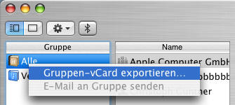 Öffnen Sie das Mac Adressbuch und klicken mit der rechten Maustaste (bzw. Strg+Maustaste) unter Gruppe auf 'Alle', und wählen dort 'Gruppen-vCard Exportieren...'